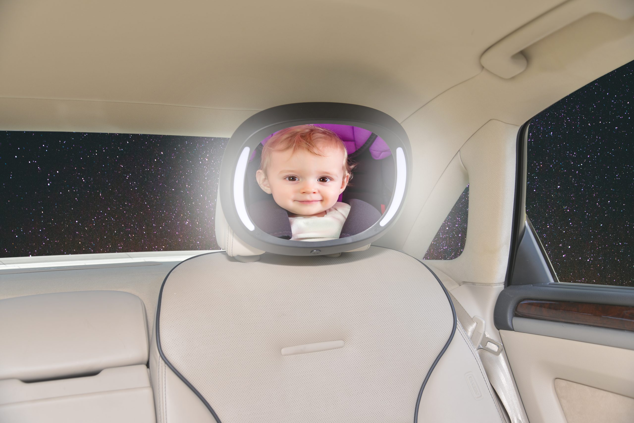När du kör på natten kan det vara svårt att se ditt barn. Med bilstolsspegeln med LED-ljus är det enkelt för dig att hålla ett öga på ditt barn i en bakåtvänd bilbarnstol. LED-lampan låter dig hålla ett öga på ditt barn och ger barnet en tröstande nattlampa. Fjärrkontrollen gör det enkelt för dig att tända eller släcka ljuset. Fjärrkontrollen har två knappar ( 10sek/ konstant ljus) Bilstolsspegeln är mycket enkel att installera och justera till den perfekta vinkeln. Den passar de flesta typer av bilbarnstolar och är lätt att ta bort när du inte behöver den.